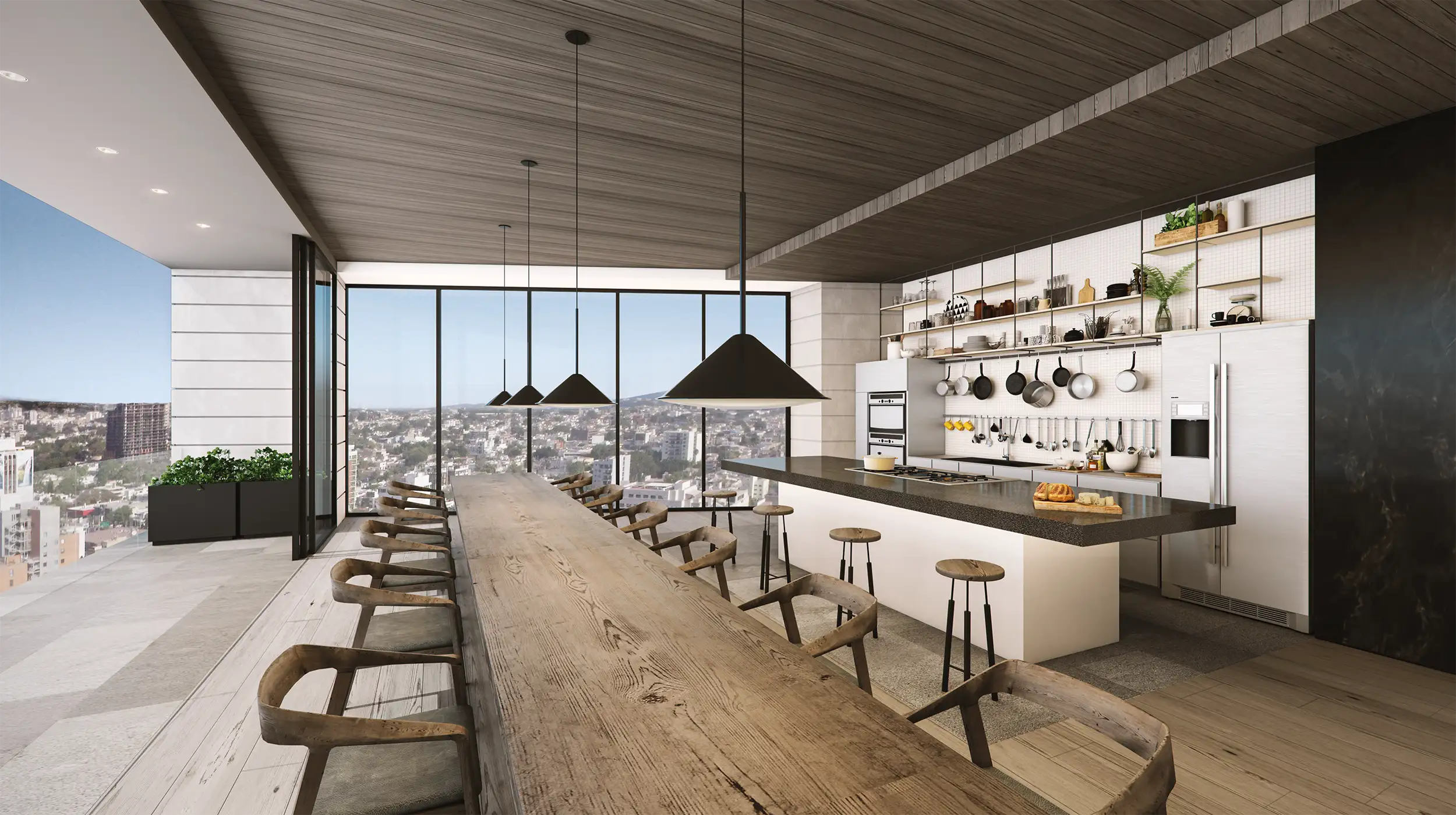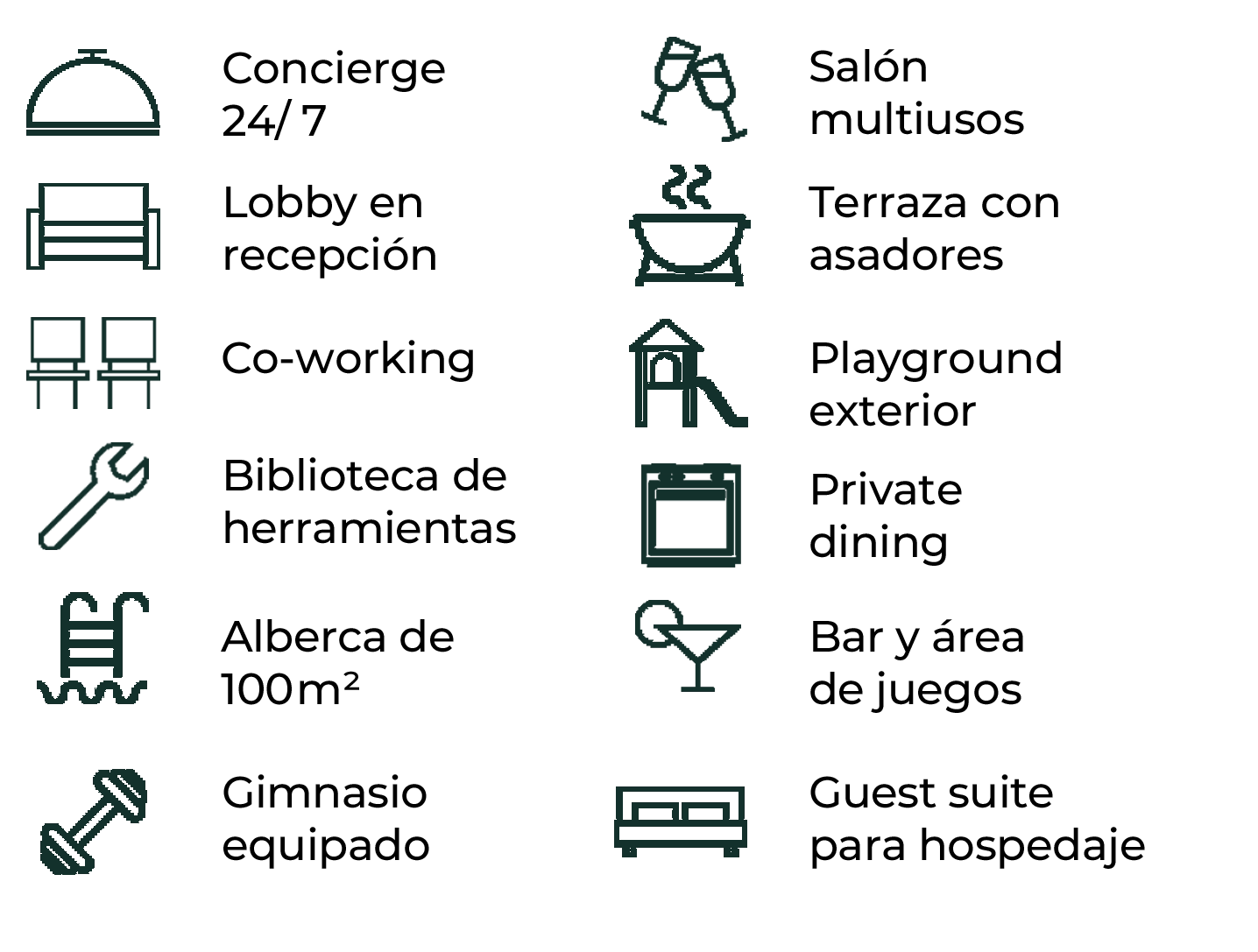 Disfruta de tres niveles de amenidades diseñadas para enriquecer tu estilo de vida: Alberca al aire libre, gimnasio equipado, spa para mascotas, biblioteca de objetos, terraza con asadores, lounge panorámico, guest suite para visitantes.